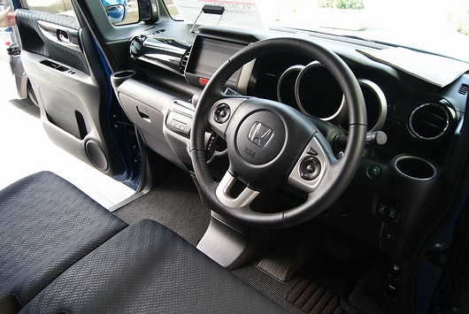 「N BOX+」の運転席周り。色が違う程度です。フロントのドアは左右共々、約90度まで開くので乗り降りが楽です。