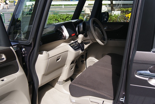「N BOX+」의 운전석 주위.색이 다른 정도입니다.프런트의 도어는 좌우공들, 약 90도까지 열므로 승하차가 편합니다.