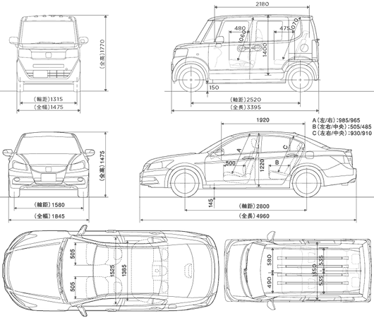 삼면도로 보는 「N BOX」.비교용으로 「INSPIRE」(US ACCORD)도 실어 둡니다.「N BOX」는 폭이 좁습니다만, 경자동차이므로 정원은 4명입니다.그 때문에, 1 인당의 시트폭은 큰 차이 없습니다.