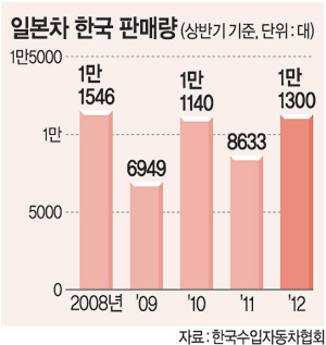 실제로 한국 체 시장으로의 일본차판매 회복도 눈에 띈다. 한국 수입 자동차 협회에 의하면 금년 상반기 일본차는 국내에 전1만 1300대가 판매되었다. 작년 동기 8633대에 비해 30.9%증가했던 것이다. 2008년 상반기 1만 1546대, 2009년 6949대, 2010년 1만 1140대로, 금년 상반기 판매량은 지난 2008년에 이어 두번째로 많은 일이다.