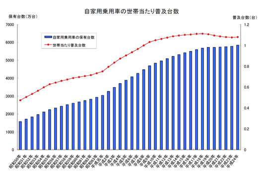 2012년의 자가용 승용차의 보유 대수는, 2011년의 5788만 8005대에서 5848만 3021대에, 세대수는 5378만 3435세대에서 5417만 1475세대에 각각 증가했지만, 6년만에 보유 대수의 증가율이 세대수의 증가율을 웃돌았다.