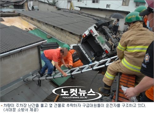 다행히 차량이 1미터 아래 옆 건물 지붕 위로 떨어지면서 안에 타고 있던 운전자 A(76)씨와 동승자 B(73)씨 등 2명은 목 통증 등 가벼운 상처만 입고 구조됐다.