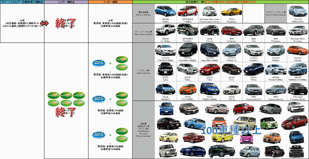 이 보조금은, MITSUBISHI 「i-MiEV」나 NISSAN 「LEAF」와 같은 전기 자동차(EV), Mazda 「CX-5」(디젤차)이나 BMW 「3 Series」(디젤차)과 같은 클린 디젤차, TOYOTA 「PRIUS PHV」와 같은 플러그 인 하이브리드 차(PHV) 등이 대상이 되고 있다.