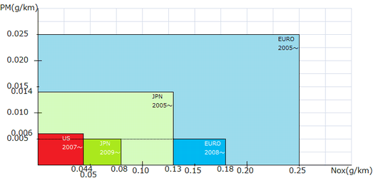 【화상:일본·미국·유럽의 디젤 배출 가스 규제치.】