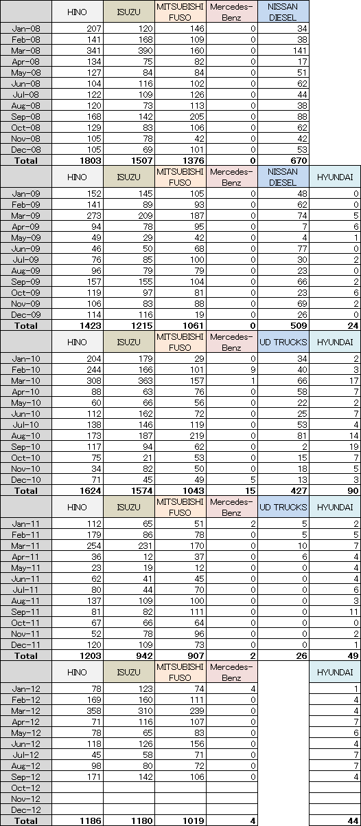 또, 이 데이터를 봐도 알도록(듯이) HINO·ISUZU·MITSUBISHI FUSO는, 1500대 전후의 수주를 유지하고 있다.동일본 대지진의 영향을 받고 있다고 해도, HYUNDAI 일본 진출의 영향은 받지 않다고 봐 틀림없을 것이다.