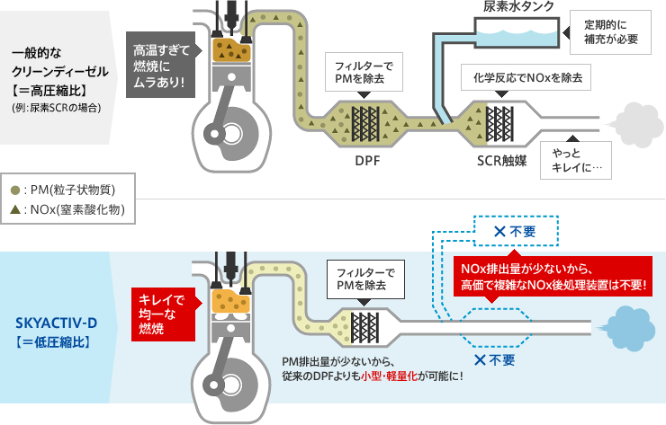 他のエンジンがNOx除去のためSCR触媒等を使わないと環境基準を満たせないのに対し、SkayActive-D はSCR触媒無しに日本,EUの環境基準を満たしています。