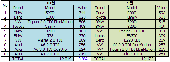 9월,10월,11월 수입 자동차 판매순위
