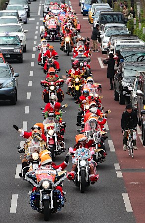 クリスマス・イブを控えた23日、都心をパレードするサンタクロース姿のライダー。ボランティア団体「ハーレーサンタCLUB」が企画。新宿や表参道をごう音をとどろかせて駆け抜け、子どもの虐待防止などを訴えた