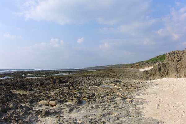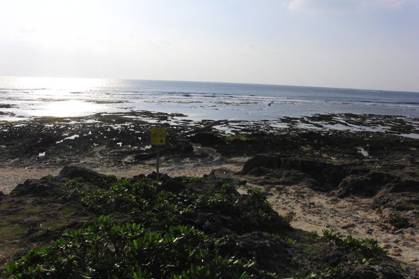 물가가 바위 밭에서, 그 륙측의 바위 밭과의 사이에에 흰 모래가 있다.처음으로 보는 지형.