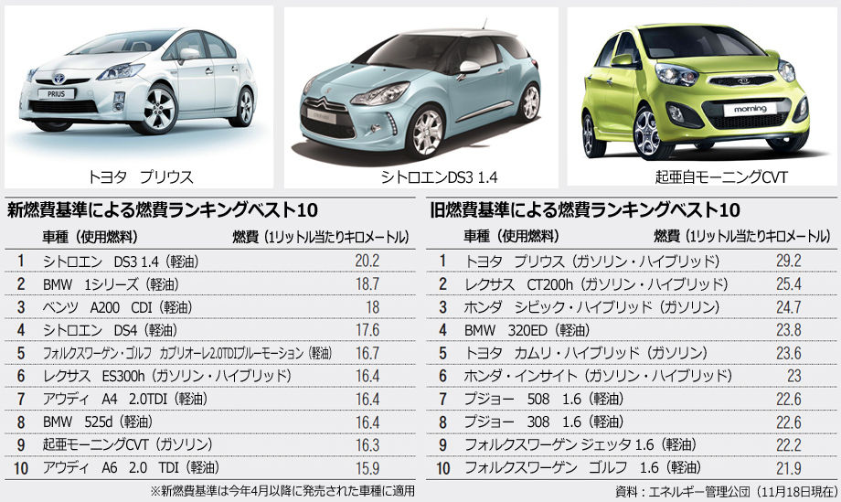 業界関係者は“ハイブリッド車種には不利に作用する急加速・低温走行などの測定要素が新しく追加されたためと見える”と話した。 その間高い燃費効率性を自慢してきた軽自動車も似た理由で燃費が大きく悪くなった。 起亜車モーニングの新燃費はL当たり15.2kmで球宴費と比較して20%ほど降りて行ったし韓国GMスパークは球宴費対比13%下落したL当たり14.8kmであった。