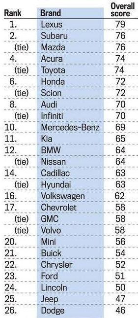 コンシューマー・リポートによる評価結果を受け、ニューヨーク・タイムズやウォール・ストリート・ジャーナルなどは「日本車の完勝」と報じた。1-7位を日本ブランドが独占したためだ。