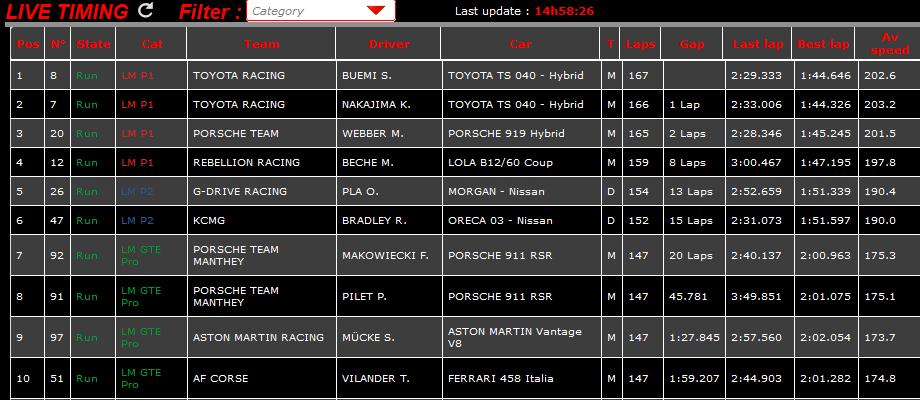 변하기 쉬운 기후에 괴로워하면서도, 알렉스・브르트, 스테펀・사라잔, 나카지마한귀의 것#7이 2위로 계속 되어, 토요타・레이싱은 WEC 참전처음이 되는,1-2finish를 장식했다.