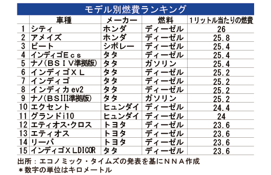 燃費効率のトップはHCILの「シティ」(ディーゼル版)で1リットル当たり26キロメートル。これに「アメイズ」(同)が25.8キロで続く。以下、シボレーの「ビート」(同、25.4キロ)のほか、タタ・モーターズの「インディゴEcs」(同25.4キロ)と「ナノ」(ガソリン、25.4キロ)などが続いた。