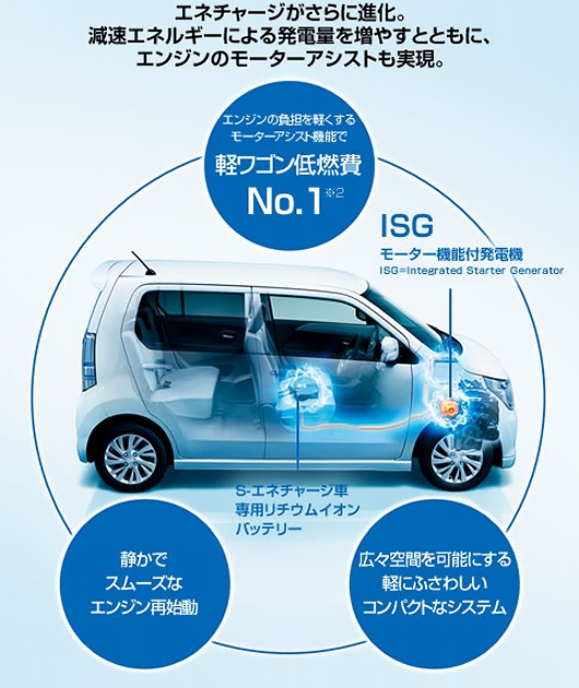 従来の「エネチャージ」搭載車に加え、エネチャージの発電機にモーター機能を追加し、マイルド・ハイブリッド化した「S-エネチャージ」搭載車も設定した。SUZUKIとしては「Twin」以来のハイブリッド軽自動車となる。システムの基本メカニズムは、NISSAN「SERENA」(SUZUKI「LANDY」)とほぼ同じだ。