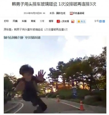2014年9月29日、中国メディア・国際在線によると、韓国で、「当たり屋」が車のボンネットにすごい勢いで飛び乗り、フロントガラスが割れるまで頭突きを繰り返す映像がネット上にアップされ、物議を醸している。