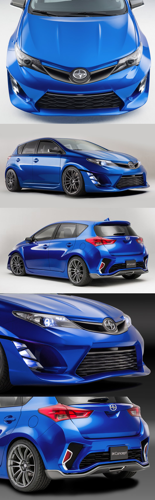 iMコンセプトは、トヨタ『オーリス』のサイオン版を示唆したコンセプトカー。オーリスに対して、iMコンセプトはレーシングカーをモチーフに、専用デザインのエアロパーツを装着。ボディカラーは専用のブルーで塗装し、マットシルバーのアクセントを追加する。