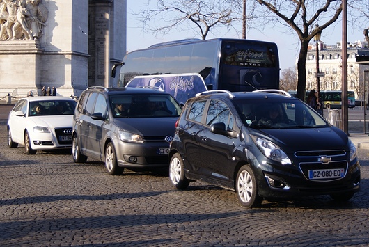오른쪽에서, Chevrolet 「Spark」, Volkswagen 「Touran」, Audi 「A3」.