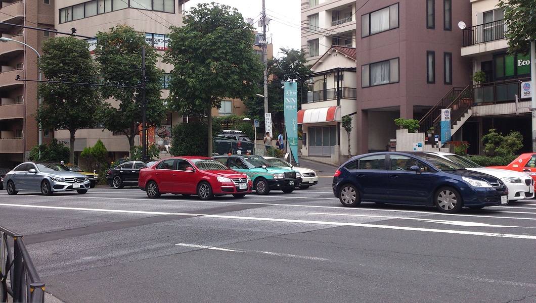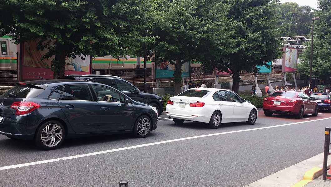 이치가야로부터 요츠야・오모테산도를 경유해 시부야 방면을 향합니다.왼쪽에서, Mazda「Demio」, Peugeot「RCZ」.