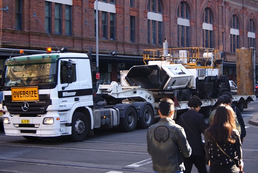 「OVERSIZE」라고 표시한 초대형 트레일러가 통과합니다.트레일러를 타고 있는 것은, 아스팔트・피니셔같습니다.트랙터는 Mercedes-Benz「Actros」.
