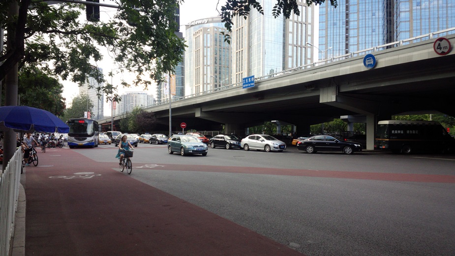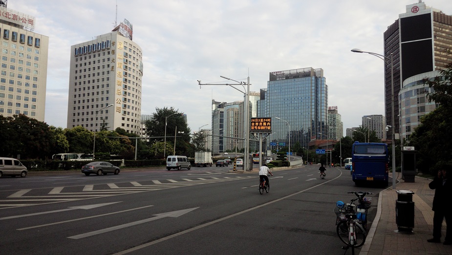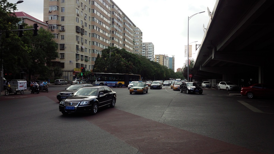 通りが広いのと携帯電話しかもっていなかったので写真が見えにくいのですが、この黒のフォルクスワーゲンやアウディのセダンの群れを見ると北京に来たなと実感します。運転席や助手席はドアミラーの手前までスモークガラスが貼ってあり、日本なら一発で検挙されそうないでたちです。見栄えの良いドイツ車の後からついてくるみすぼらしいタクシーは北京現代のエラントラですね。左折しているのはホンダアコードのようです。