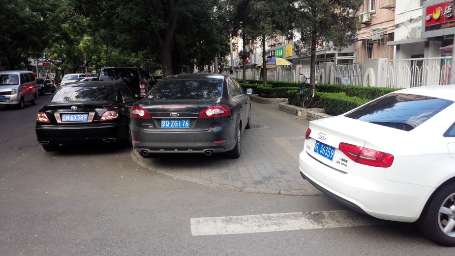 右からアウディA4、フォードモンデオ、トヨタREIZ(マークX)。なけなしの金を叩いて買った高級車を路上や歩道に放置するのがこちらの流儀のようですね。乳母車や車いすでは通りにくそうですが、どうせ夫婦で一人しか産めないし、車いすの人はほとんど見かけないし(いないのではなく、外出できないだけでしょうけど)。