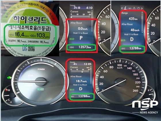 시승은 서울 시청을 출발해, 강남, 영등포, 양천구 등 서울 도심에서 진행되어 사진 촬영을 위해서 경기도 고양시 킨텍스 주변 도로총 215 km의 구간에서 평균 46km / h의 속도로 진행되었다.시승 결과, 렉서스 ES300h 하이브리드 차의 도심 연비는 놀랄 만한 일로 18.7km /ℓ를 기록했다.