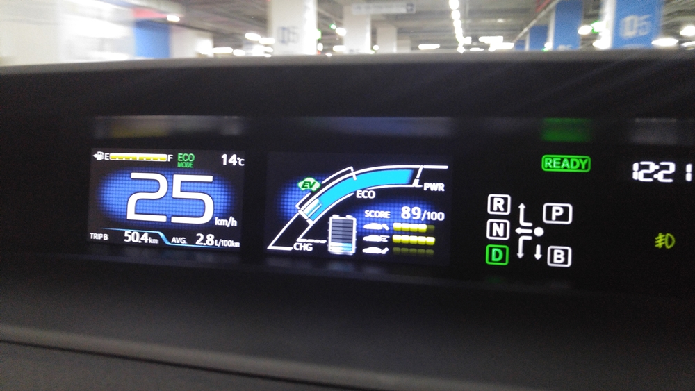 서울 잠실 제 2 롯데월드 몰 코노우라 소재 커피 숍까지 편도 50km 에 이르는 구간을 마음으로 결정해 연비 주행을 시도했다.최대한의 전기 모터를 사용한 주행을 실시한 연비 주행의 결과 인스트루먼트 패널에 표시된 연비는, 「2.8l / 100km」.100km 를 주행하기 위해서 2.8 리터의 가솔린이 필요하다고 하는 것을 의미한다.1 리터 당 35.7km 를 주행한 것이다.4 세대 프리우스의 국내 공인 연비는 복합 기준 21.9km / l 이다.