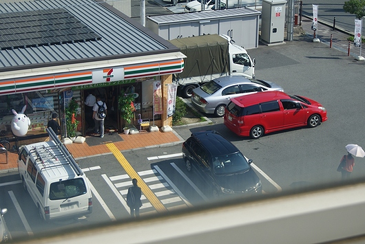 모노레일의 차내로부터 보인 7-ELEVEn.점내의 LED 조명화와 옥상의 태양광 발전으로 소비 전력을 억제한 에너지 절약형 점포가 증가하고 있다.