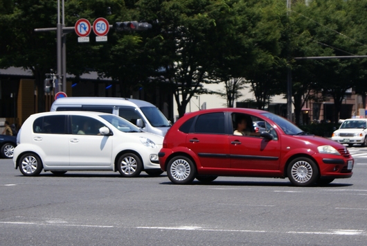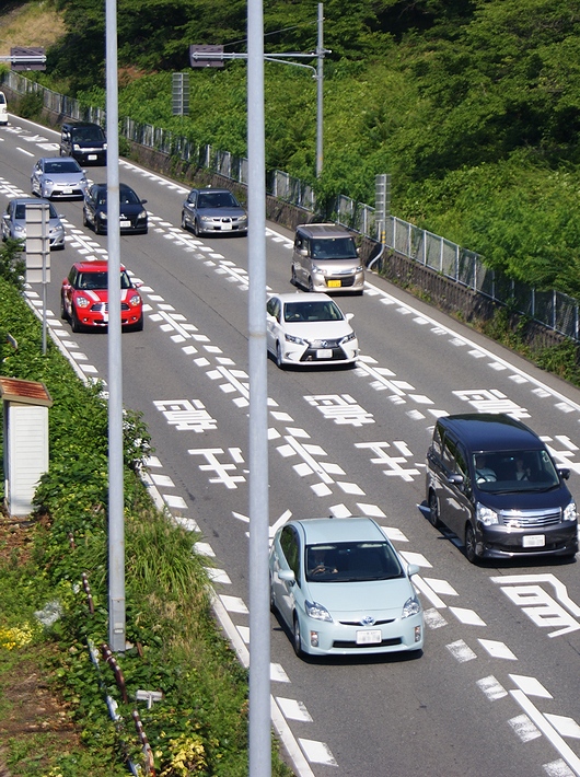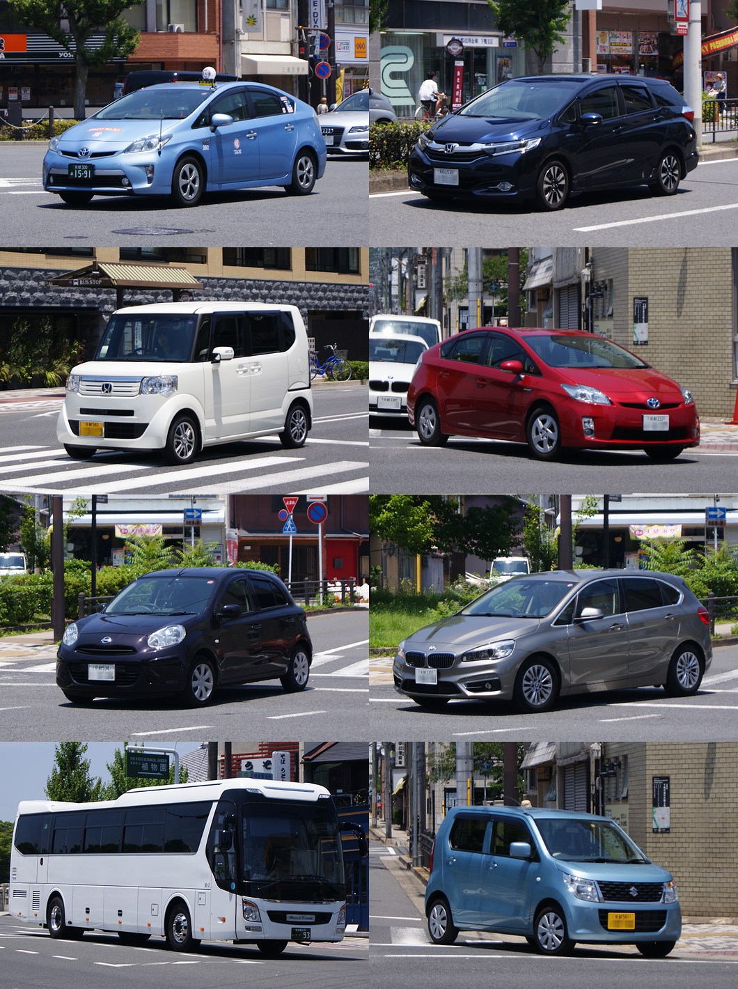 앞으로부터, TOYOTA「PRIUS」, TOYOTA「NOAH」, LEXUS「HS」, BMW「MINI Crossover」, SUZUKI「PALETTE SW」, TOYOTA「Vitz」, OPEL「ASTRA WAGON」, SUBARU「IMPREZA」, TOYOTA「PRIUS」, Honda「MOBILIO」.HV, 미니밴, 경・・・일본의 자동차 사정을 잘 안다.