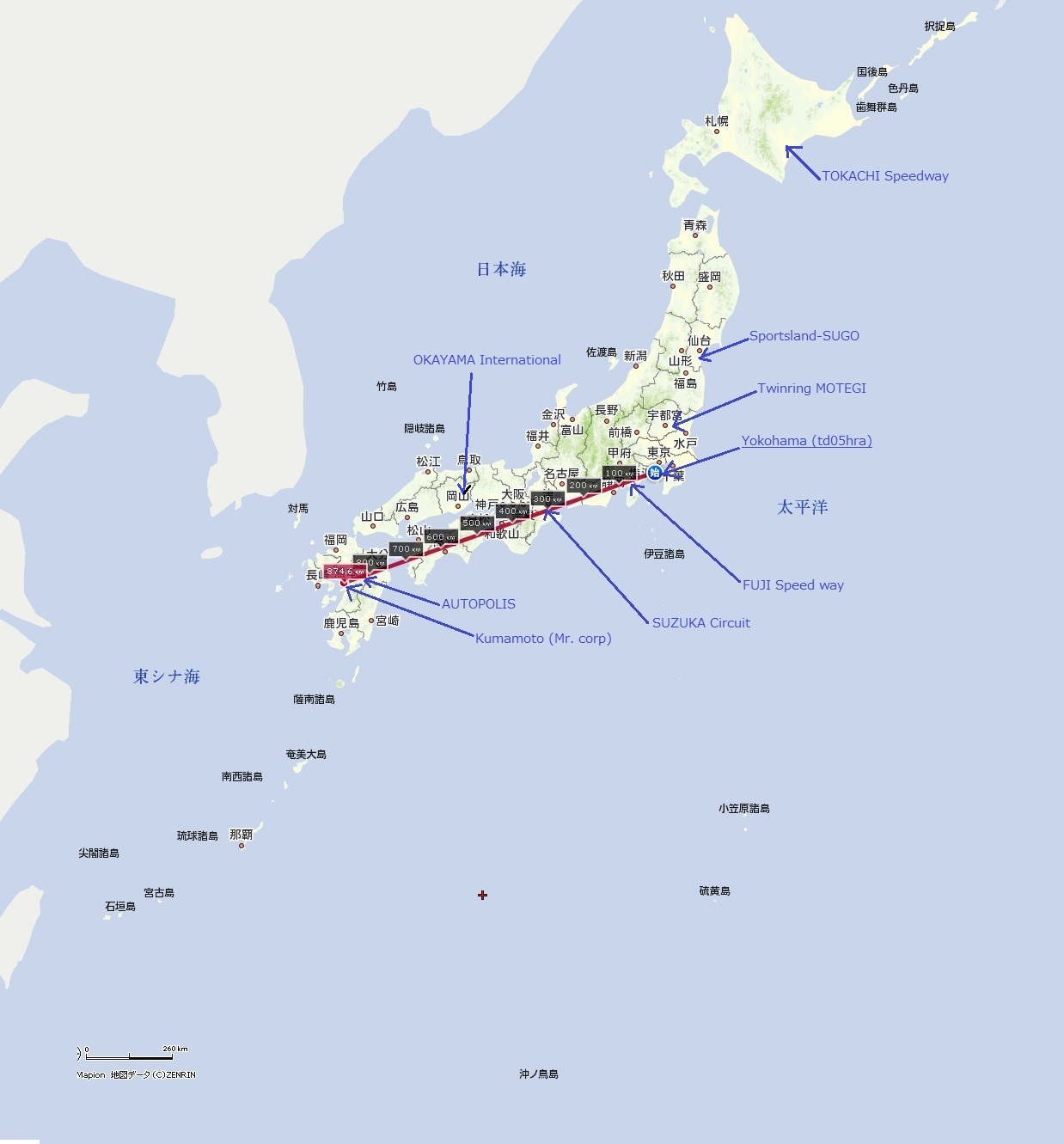 ついでに、日本国内の代表的な国際格式のサーキット(FIA公認)の場所も簡単に示しておきます。