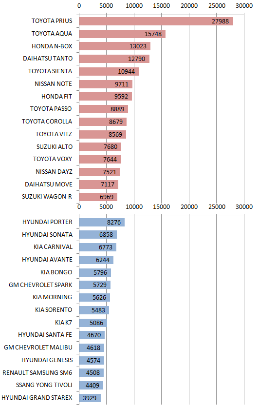 자판연 등 3 단체는, 7월의 차명별 신차판매 대수를 발표했다.1위는 TOYOTA의 HV「PRIUS」, 2위는 같이 TOYOTA의 HV「AQUA」, 3위는 Honda의 경자동차「N-BOX」였다.그 외 , TOYOTA「COROLLA」나 Honda「FIT」 등 HV설정이 있는 차종,NISSAN「NOTE」나 TOYOTA「PASSO」 등 컴팩트 카, TOYOTA「SIENTA」나 TOYOTA「VOXY」라고 하는 미니밴이 인기였다.