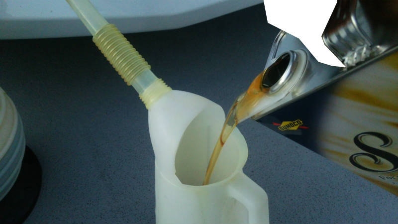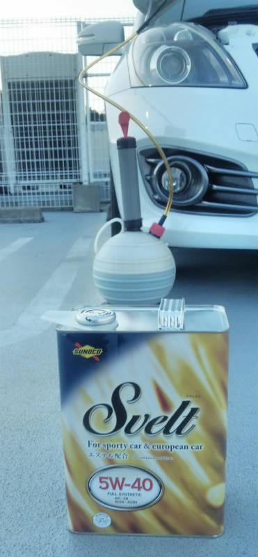 車体をジャッキアップするのは面倒なので、通称「コロ助ポンプ」で上から抜きます。