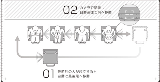 このチェアの機能は、先行する椅子を認識し、一定の距離を保ちながら追従する機能、および指定されたルートに合わせて自動でストップ・アンド・ゴーを行