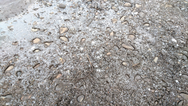しばれてるねぇ。水たまりは氷が張って、土も中の水分が凍ってるよ。夕べは道東や道北の広い範囲で積もるほど雪が降ったそうで。
