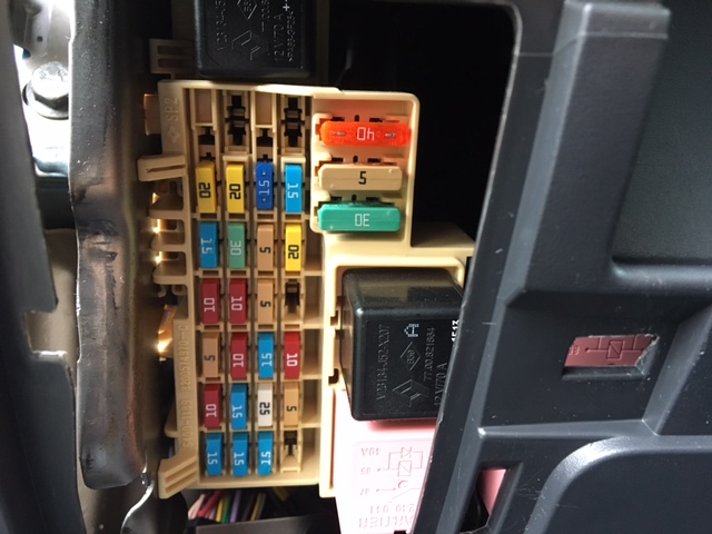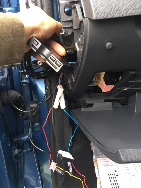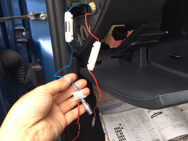 電源は助手席側のヒューズボックスから取り出す事に。この機種はACC電源と常時電源両方必要でした。しかし車体取説のヒューズ表示と実際の表示、結構違うもんで混乱しちゃいました。