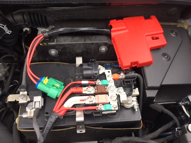 まずはバッテリーの端子を外しショート対策。今時のクルマ、端子もカプラー接続で端子カバーも全面覆うようにできているんですねぇ。