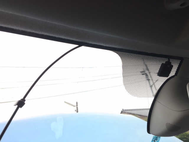 アンテナはミラーの脇に。配線にクッション材を巻き付けて天井内張との間に押し込みます。