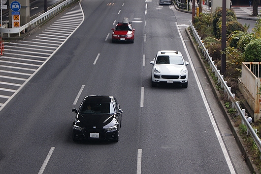 요코하마 역전의 도로입니다만, 고급 외제차가 많네요···BMW 「3 Series」, Porsche 「Cayenne」, Audi 「A4 Avant」(앞으로대).