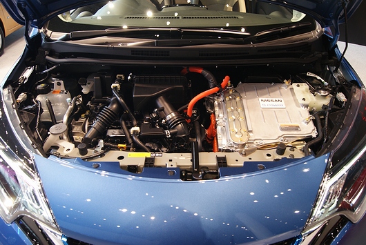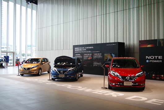 신형 「NOTE」가 전시되고 있었어요.탑재 엔진으로 발전, 전기로 작동시키는 차입니다.
