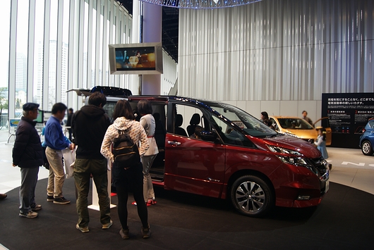 이쪽은, 동일 차선 자동 운전 기술 탑재의 「SERENA」.다리로 열리는 슬라이드 도어등의 기능을 소개하고 있었습니다.