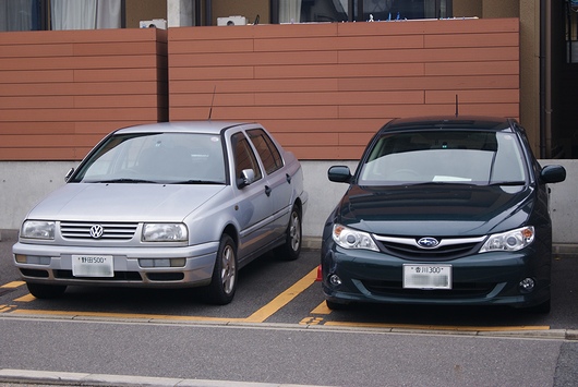 노다(치바) 넘버의 Volkswagen 「Vento」(절판)과 카가와 넘버의 SUBARU 「IMPREZA」(앞으로대).그렇다 치더라도, 먼 곳의 넘버가 많다.공공 교통기관의 이용이 바람직하다고 해도, 30분에 1개 나와 있는 비행기는 커녕, 3분에 1개 나와 있는 신간선조차 혼잡하고 있으므로, 어쩔 수 없는 것인지도 알려지지 않습니다.