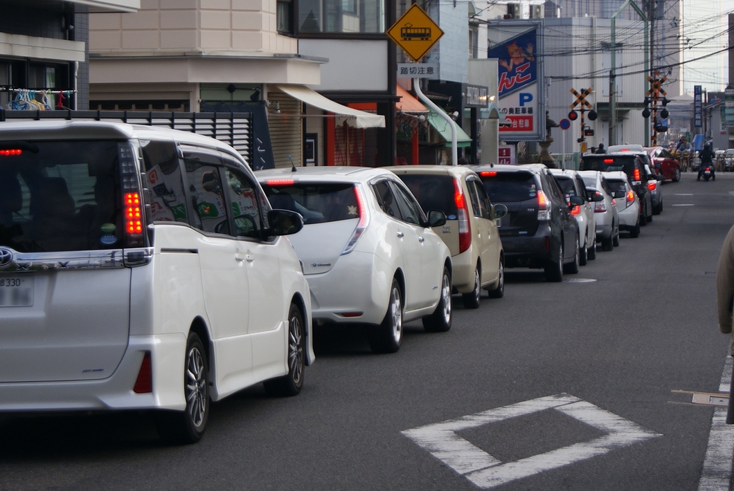 駅に向かう途中、踏切待ちをする自動車の数々。HVや電気自動車(EV)が半数を占めています。