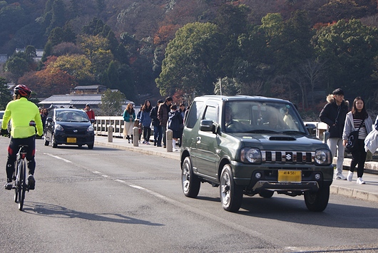 渡月橋の上は自動車も通ります。高齢者が運転する岐阜ナンバーのSUZUKI「JIMNY」。後ろは、DAIHATSU「MIRA e:S」。