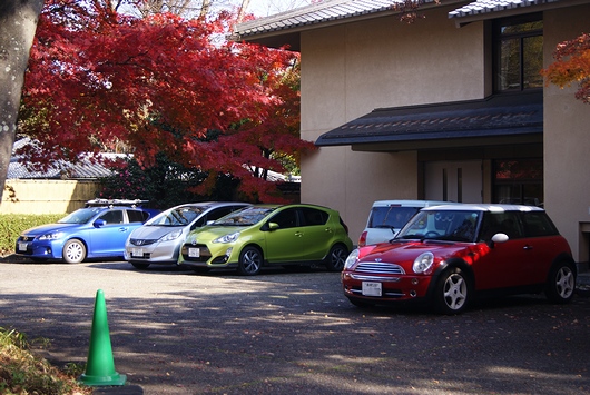 네리마(도쿄) 넘버의 LEXUS 「CT」, 나고야(아이치) 넘버의 Honda 「FIT」(선대), 나고야(아이치) 넘버의 TOYOTA 「AQUA」, SUZUKI 「ALTO LAPIN」, 시마네 넘버의 BMW 「MINI」(앞으로대).