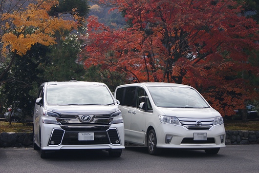 名古屋(愛知)ナンバーのTOYOTA「VELLFIRE」と北九州(福岡)ナンバーのNISSAN「SERENA」。