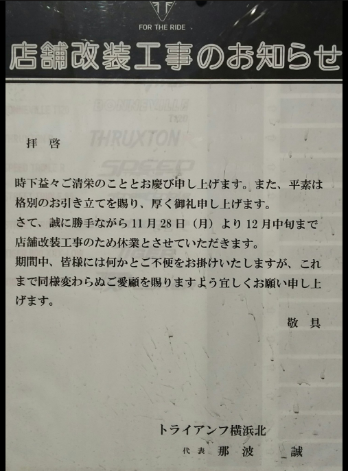 バイク販売店「トライアンフ横浜北」が夜逃げしたのではないかと話題になっている。このバイク屋は11月28日より店舗改装ために一時休業としていた。実際に店には「店舗改装工事のお知らせ」と告知が貼られており、11月28日から12月中旬まで休業するとしている。