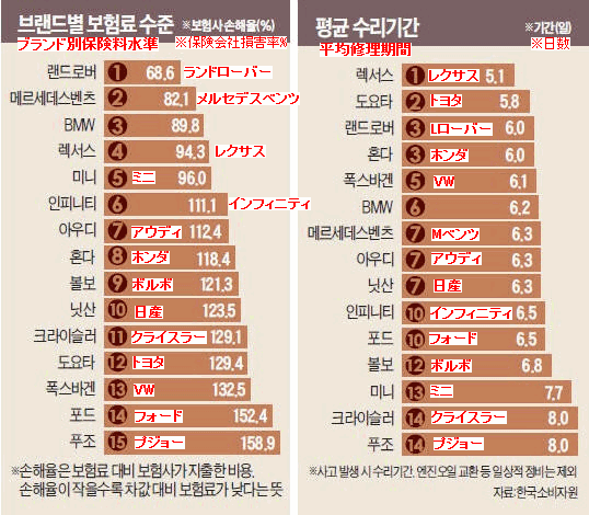 보험료에 비해 보험금(사고시의 보험 회사가 지급하는 수리비등의 코스트)을 나타내는 손해율로 68.6%로 압도적 1위를 차지하고 있어 차량 1만대 당의 작업대도 성과 101.1개로 2위 푸조(46.4개)를 크게 웃돌았다.