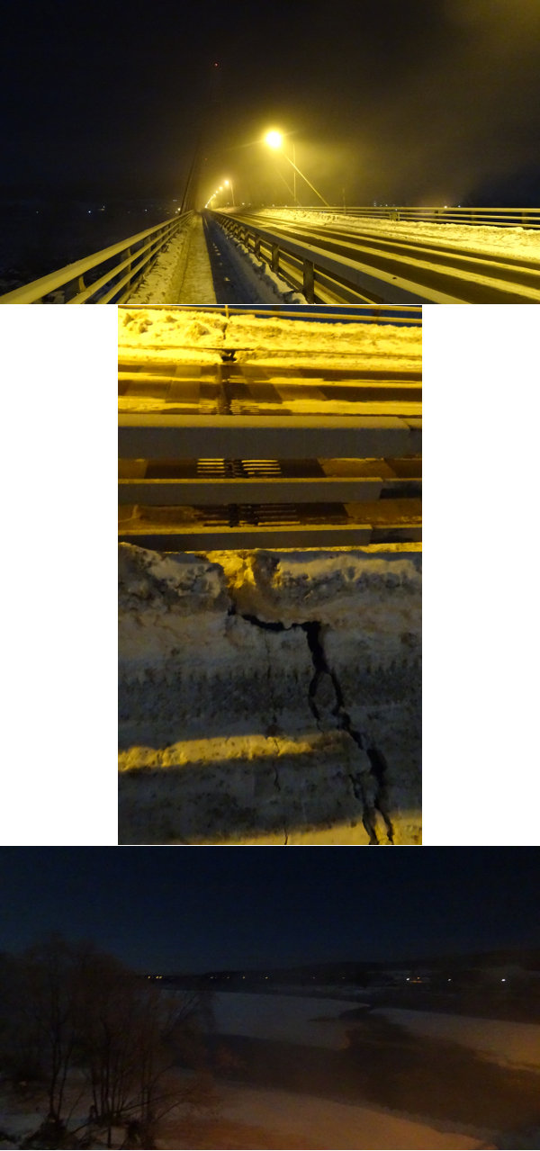 橋台と橋梁の継ぎ目部で、凍結した路面の氷がバッキリ割れてましたよ。あまりの寒さに橋梁がだいぶ縮こまったんでしょう。
