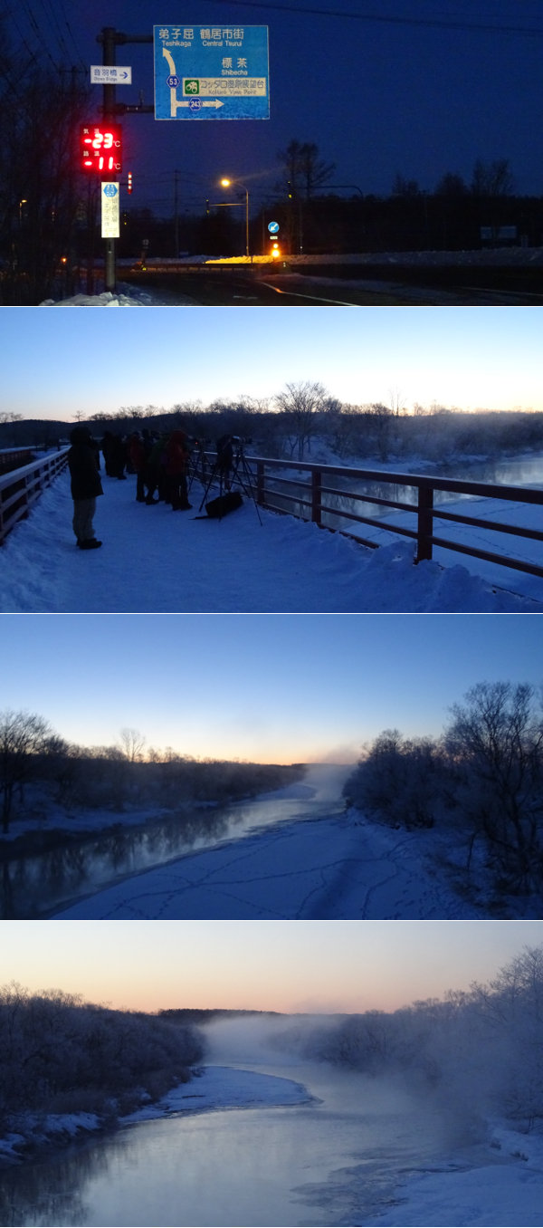 川面の上にはけあらしが。凍っていない川の水温は当然0℃以上で、その水面から蒸発した水蒸気が氷点下20度以下の気温で冷やされて湯気のようになるそうで。