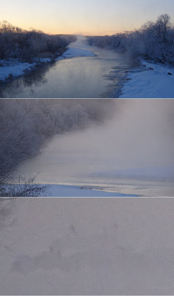 강수면 위에 브러쉬 폭풍이.얼지 않은 강의 수온은 당연히 0℃이상으로, 그 수면으로부터 증발한 수증기가 영하 20도 이하의 기온으로 차게 해져 김과 같이 완만한 것 같고.